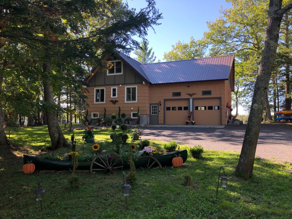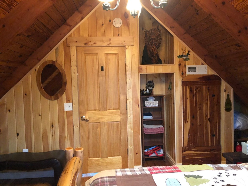 Loon Landing Bedroom is located on the top level of the lake house. It has a large window which faces the woods and road side area of the home. It has a full size mattress and a hand carved log bed frame. The bedroom also has a 1950’s cedar clothing cabinet, a pine dresser, southern pine wooden floors and ceiling, a large paddle fan and a wooden statue set into the wall. Please see photos below-