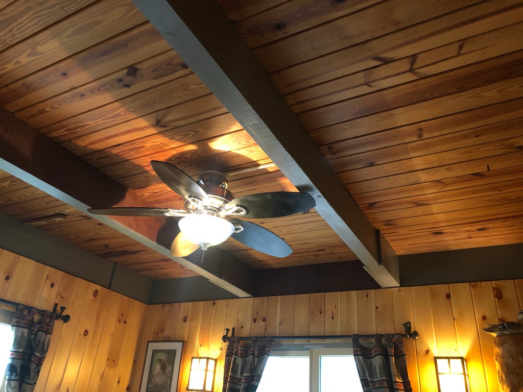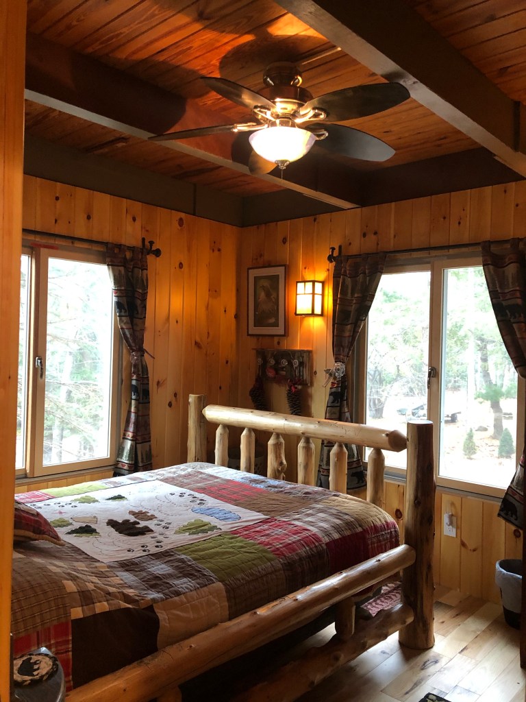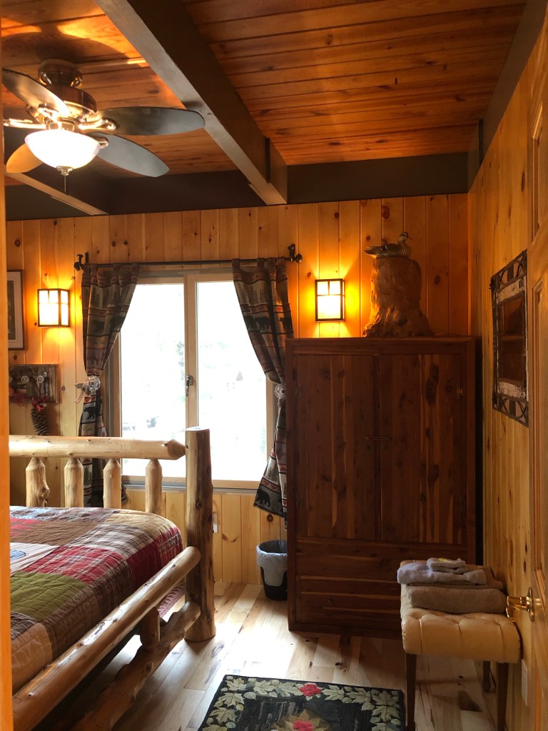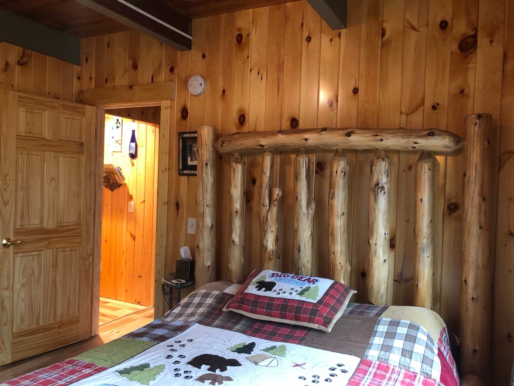 The Owl’s Nest Bedroom is located on the main level of the lake house. It has a queen size mattress and a hand carved log bed frame with a 6’ headboard. The bedroom has two large windows, a paddle fan, pine walls and ceiling. There is a 1950’s cedar armoire in the bedroom and the flooring is made of hickory wood.